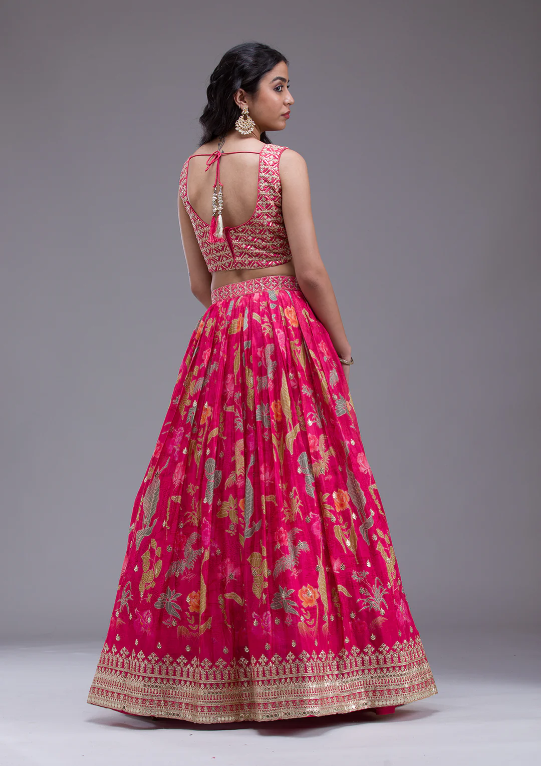 Dive into the vibrant world of celebration with stunning Fuchsia Georgette Lehenga, shimmering with sequins that catch every flicker of light. This masterpiece blends timeless elegance with a playful twist, featuring a luxuriously soft georgette fabric that dances as you move. Ideal for weddings or any event where making a spectacular entrance is a must, this lehenga promises to be your new favorite for unforgettable moments!.
